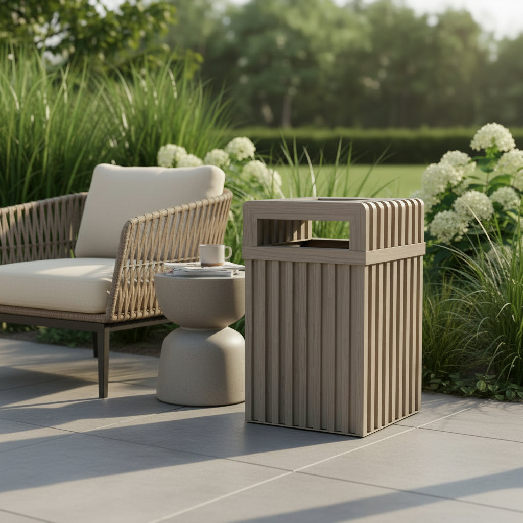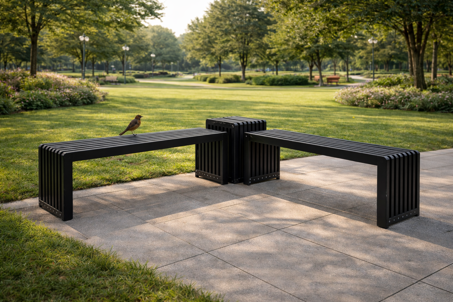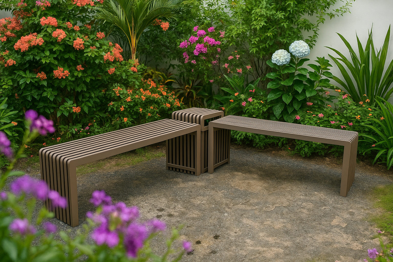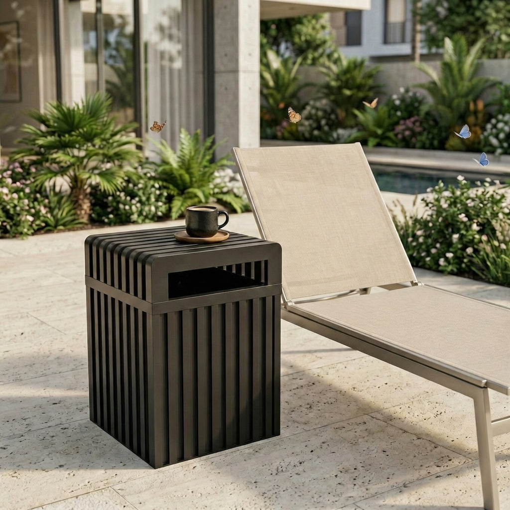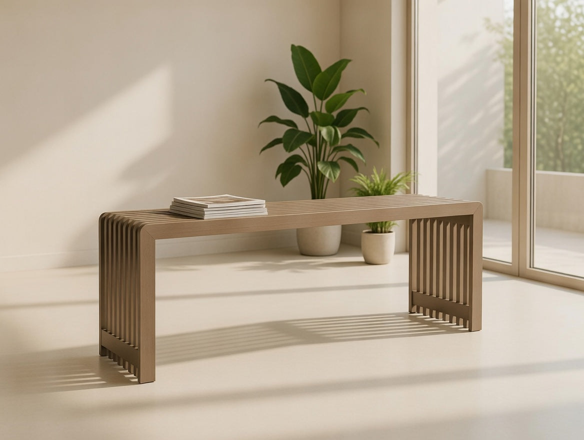 This contemporary, elegant bench seamlessly complements any setting—be it a stylish rooftop lounge, a corporate courtyard, or a residential patio. It stands out beautifully alone or can be combined with coordinating benches and a corner table to create a cohesive ensemble