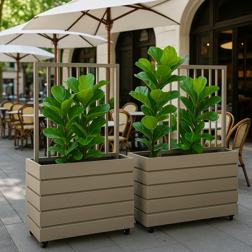 Design an ideal setting for hosting, outdoor meals, or unwinding with our planter dividers. Constructed from lightweight aluminum and equipped with sturdy casters, these mobile units offer versatile arrangements to effortlessly tailor the space to your preferences